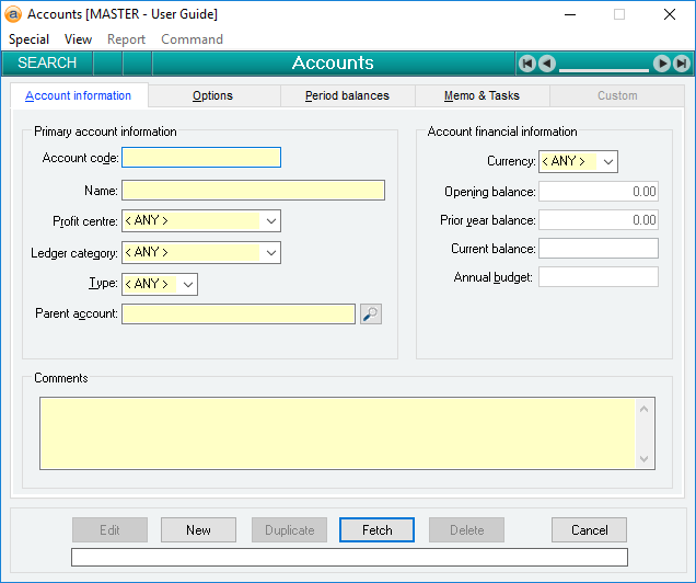 Every account is identified within Accentis Enterprise using a unique, alpha-numeric, user-definable Account code. All functions within the system that deal with accounts use the account’s code.
