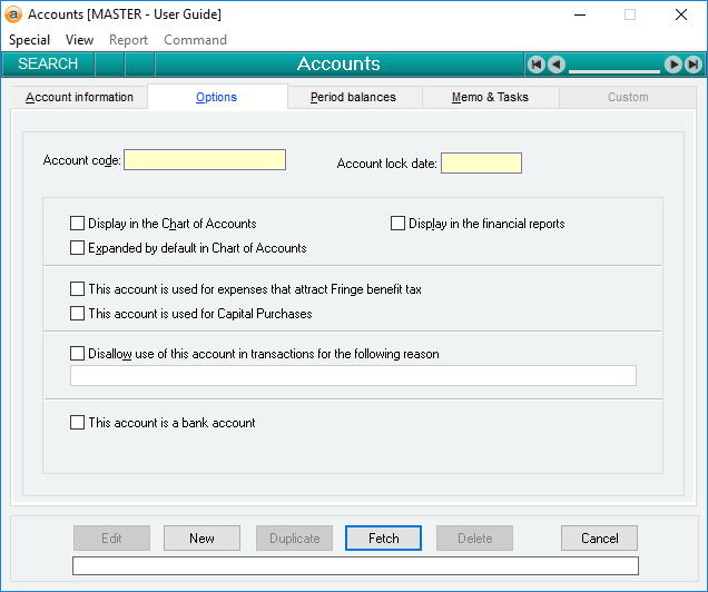 This option specifies that expenses attracting Fringe benefits tax are assigned to this account. Setting this option will NOT cause Fringe benefits tax to be automatically accrued.