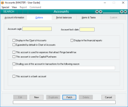 This option specifies that the account represents a Bank account and as such, has bank account details specified for it. To specify the bank account details for the account, click on the bank account details button while in Edit mode.