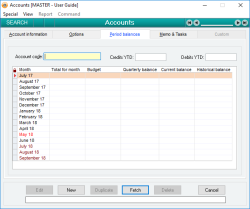Every account has an Opening balance and a Current balance, as well as a breakdown of the values of transactions performed on the account for each month and quarter of the financial year.