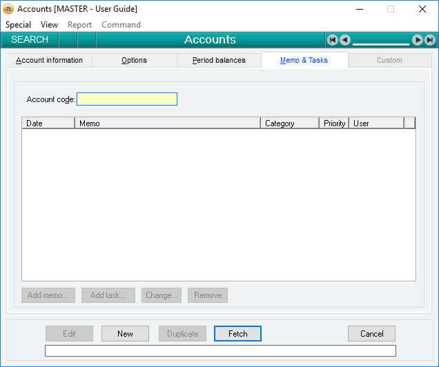 The account memo section allows you to enter an unlimited number of memos to record historical events and facts about the account.