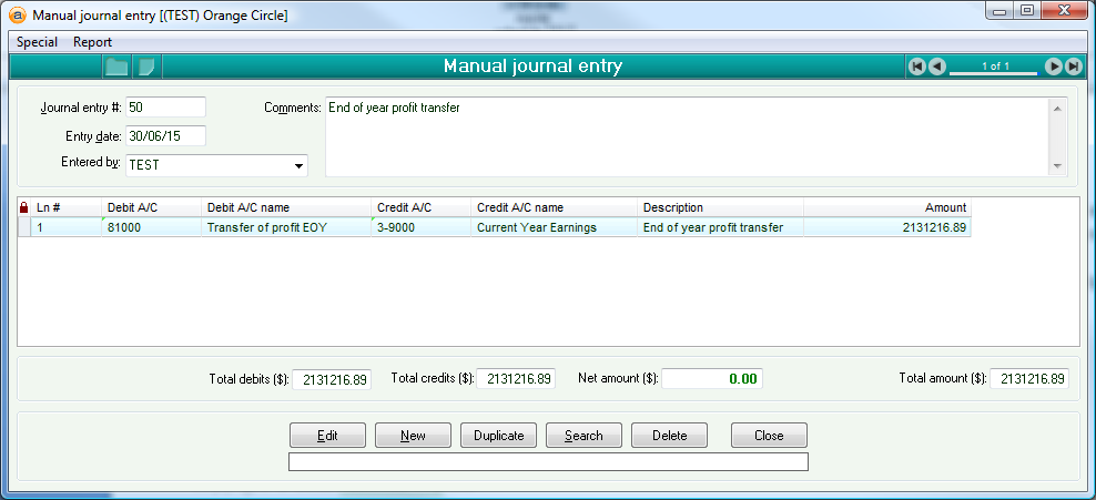 - Ensure you are currently logged into the database for the same financial year for which you are transferring the profit (e.g. this will usually be the prior financial year to the current one)