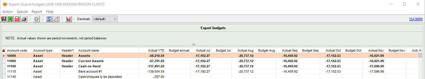 - Open report SA3889 (Ctrl + Shift + R) and click the Excel icon to export your current budgets.