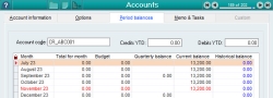 - On the Period balances tab tab, you can individually set budgets for as many or as few months as you like. This table will also show you your current, quarterly, and historical balances.