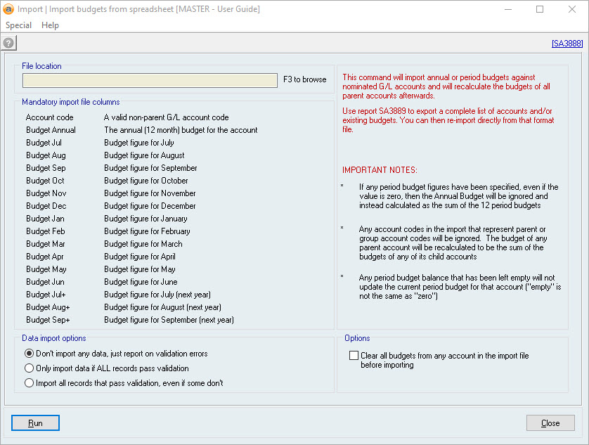 - Check that your budgets have been imported correctly by viewing report SA3889