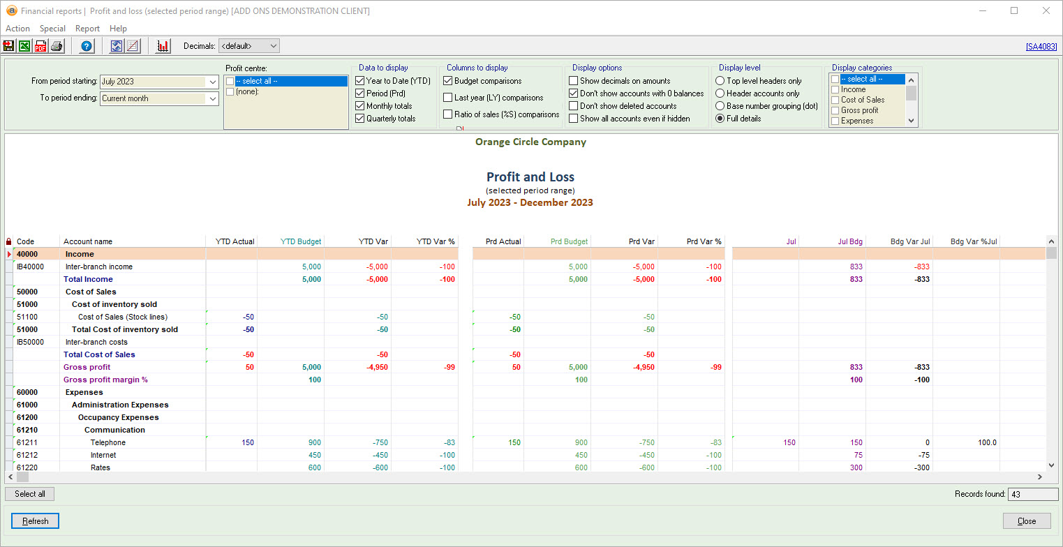 In Accentis, Budgets will display in your Profit and Loss reports (e.g., SA4083) in the following ways: