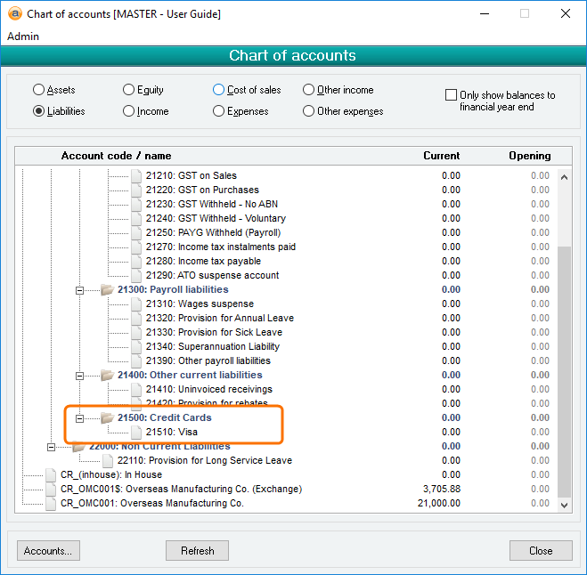 - The recommended approach is to ensure that a general ledger account that represents your credit card exists – just like your bank accounts. Many people will allocate this under liabilities, just like a loan account.
