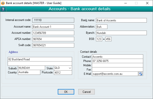 This is the Account code of the account to which the bank account details correspond. This is a read-only field and is included on the form for convenience only. The code shown here is always the same as the account code displayed on the account form when the bank account details button was pressed.