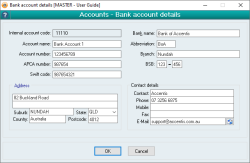 The Bank account details form enables you to enter the bank account details that relate to one of your General ledger Accounts. The form is activated from the account form's bank account details button but will only be available if the corresponding account is specified as being a bank account.