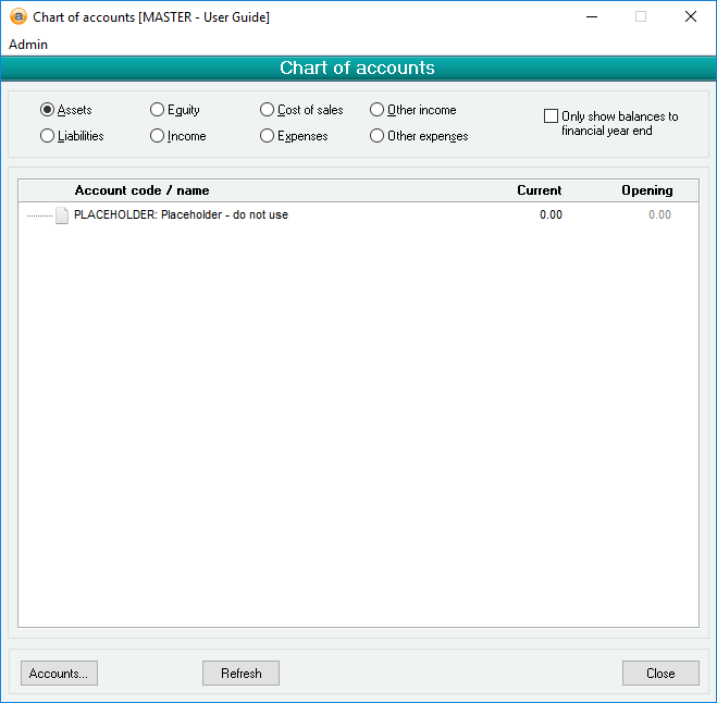 While the Chart of Accounts is primarily for viewing accounts and its balances, it can also be used to manipulate the position and parent accounts within the tree structure. There is also an option to display the values of accounts to the end of either the extended financial year or the actual financial year.
