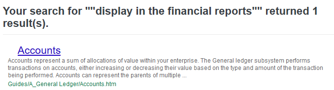 To enable accurate searching, you may try using quotation marks to narrow a search and display the content directly related. For example, if you wanted to search for Display the financial reports, enter it into the search bar within quotes.