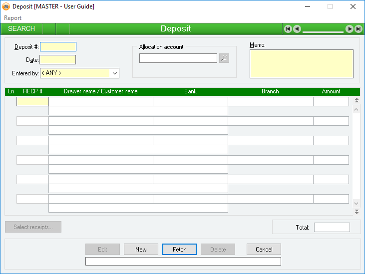 - The Deposit number of any Receipt that exists in the Deposit lines is updated to be the current Deposit number.