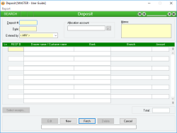 The Deposit form is the means by which you carry out the transfer of receipted payments to your bank. After a cash or cheque Receipt has been entered for a payment from a Customer, it is usually placed into a “cash on hand” account which will then be deposited into a bank or other account at a later stage using the Deposit form.