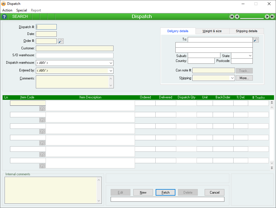 A Dispatch can only be performed for some or all of the items on exactly one Sales order, and is referenced throughout the system by its Dispatch #.