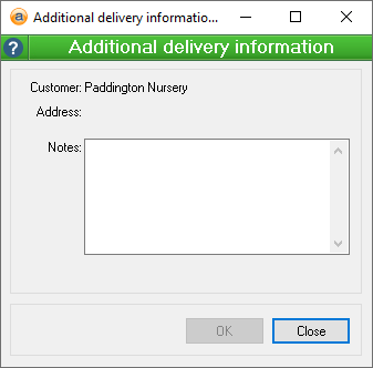 Pressing this button allows extra information about any delivery made when this address is selected in a Sales quotation, Sales order or Sales invoice. It can include additional delivery notes that are unique to this address. Depending on your reports configurations, they can appear on delivery dockets and sales order confirmations.