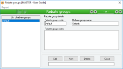 When you want to edit or delete a rebate group, highlight the group in the list and click on the Edit or Delete button.