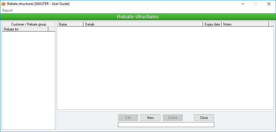 - Expiry date: This is the expiry date for the Rebate structure specification, after which the specification will not be used. Double clicking on an entry in the list while in Edit mode will cause the Rebate structure edit form to appear.