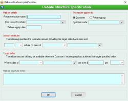 The Rebate Structure facility allows a highly configurable means of providing rebates for Customers based on a range of criteria.