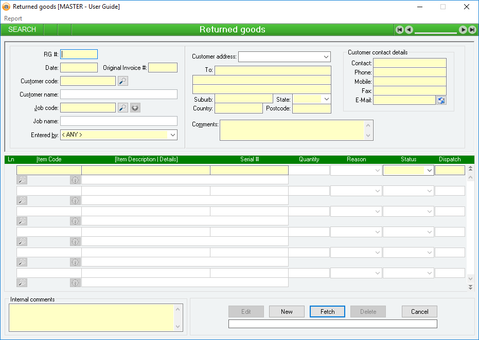 Goods which have been received through the Returned goods system can be sent for repair to a third party, repaired internally or returned into stock for credit or refund.
