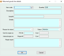 This button activates the Repair / Return line details window, in which extra information about an individual Sales order, Dispatch or Sales invoice line can be entered.