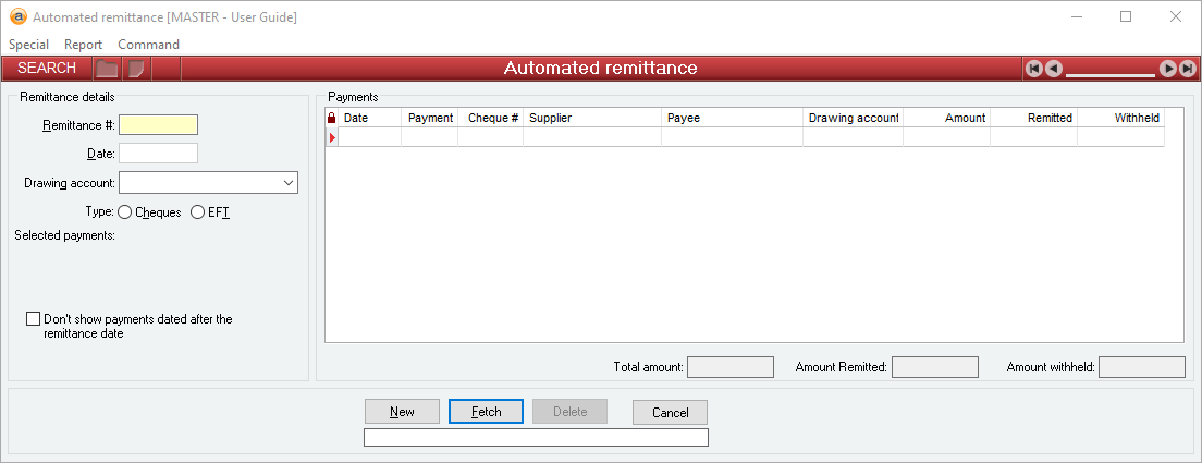 This is the list of all Payments eligible for automated remittance. For a Payment to appear in this list, it’s Remittance type must be either cheque or EFT and it must not have a remittance date. The entries in this list will depend on the combination of the remittance type and Drawing account selected.