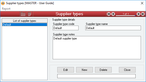 The list of supplier types is non-editable and serves only as a display and selection method. When you are ready to edit or delete a Supplier type, ensure that you have the desired Supplier type selected in the list before clicking on the edit or delete button.