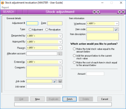 A stock adjustment would typically be used when you want to specifically adjust up or down the current quantity in stock of an item for a reason other than one of the usual stock transactions such as a Dispatch or a Receive. When you perform a stock adjustment, you are also given the opportunity to specify the cost (or stock value) of the item that is being adjusted.
