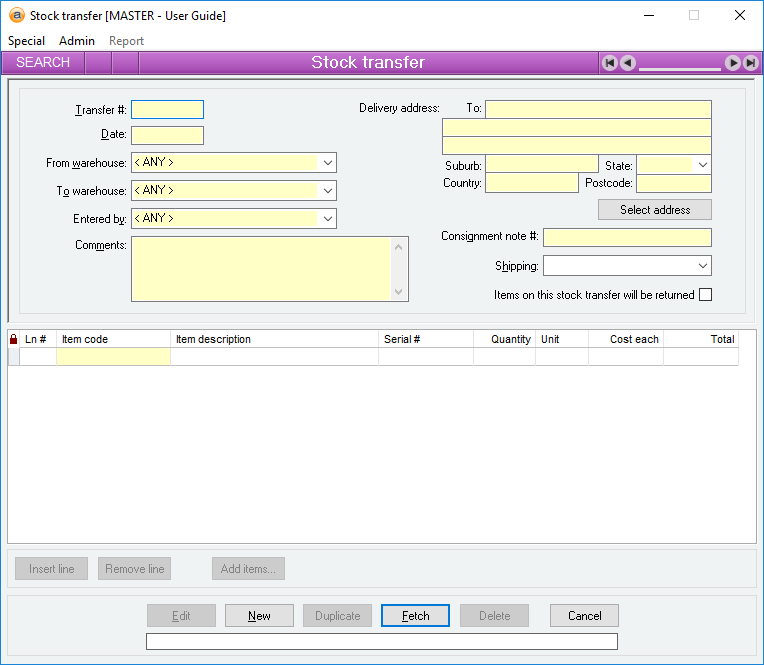 A Stock transfer allows you to transfer one or more stock Items from one warehouse to another warehouse. The Items are removed from the source warehouse at their current average cost and added to the destination warehouse at the same cost as they were removed from the source.