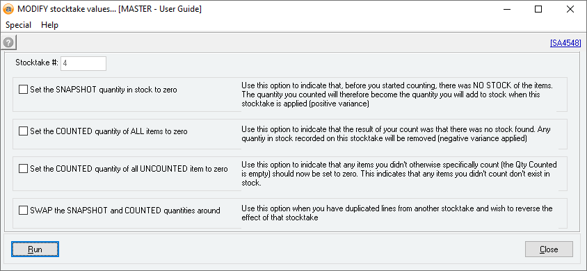 These options are available to adjust stocktakes as needed in specific situations. If you don’t understand what these tools are for, do not use them.