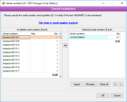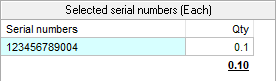 This is the serial number of the item. When in EDIT mode, you can highlight this field and press F3 hotkey to display the Serial number selection form. The first serial number selected will be displayed.