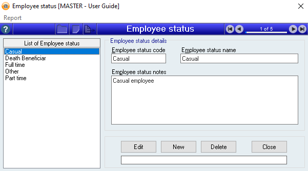 Employee status allows you to classify employees according to the basis of their employment, primarily Full time, Part time or Casual. You are able to add you own Employee status values as needed to further classify the employment status of your employees.