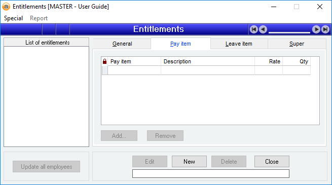 An Entitlement is usually used to specify to which award an employee belongs from an industrial relations perspective. Once an Entitlement for an employee has been selected, the individual Pay and Leave items for that employee can be tailored to suit the individual.