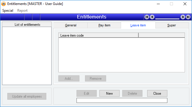 Leave items are added and removed from the Entitlement Leave item list by using the Add or Remove button while in Add or Edit mode.