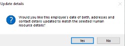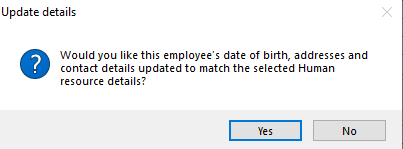 - The report will close and the below message will pop up. Click yes to update the details to match the H/R record and No to leave the details the same.