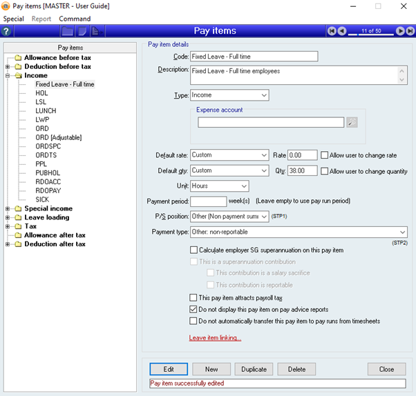 - Add the Pay item to the pay run by default (Payroll > Command > Manage employee pay items SA4062)