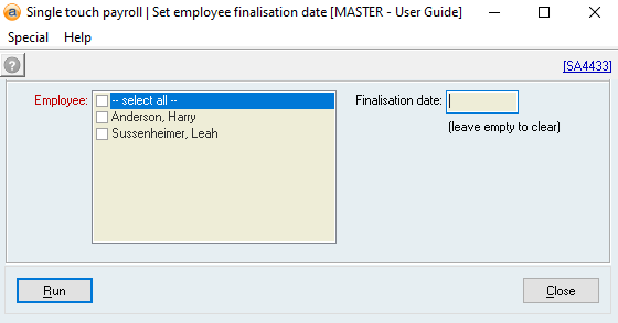 - Go to the Payroll > Commands > Single touch payroll > Set employee finalisation date (Command SA4433)