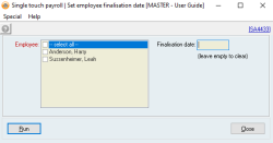 When you go to the STP Finalisation and Lodgment screen, it will only display employees who need to be finalised for the financial year. If you want to force through another finalisation even if no changes have been made (perhaps a prior one failed to lodge properly), you will need to reset the Finalisation date for the employee. To do this:
