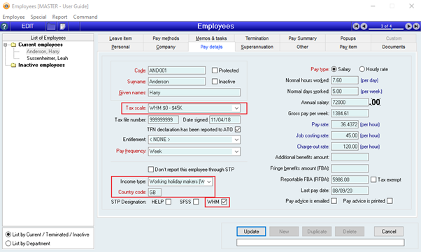 - Ensure the correct tax scale is chosen – a working holiday maker will always start on the WHM $0- $45K tax scale. When the employee has reached $45,000 in earnings, you will need to manually adjust the tax scale in the employee file to the next one (WHM $45K - $135K).