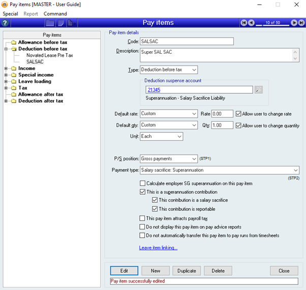 - Double click on the added pay item and set the Default rate to be the amount of the salary sacrifice