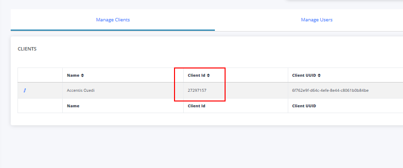 Once you have completed the registration, account and client steps with Ozedi, take a note of the 8-digit Client ID as displayed in the example below, as you will need to provide this to Accentis Support. All other ID fields (e.g. UUID) can be ignored as they are not utilised in Accentis Enterprise. You can also find the Client ID in an email that Ozedi sent to you when you created the Client. You can forward this email directly to [email protected] for an easier result.