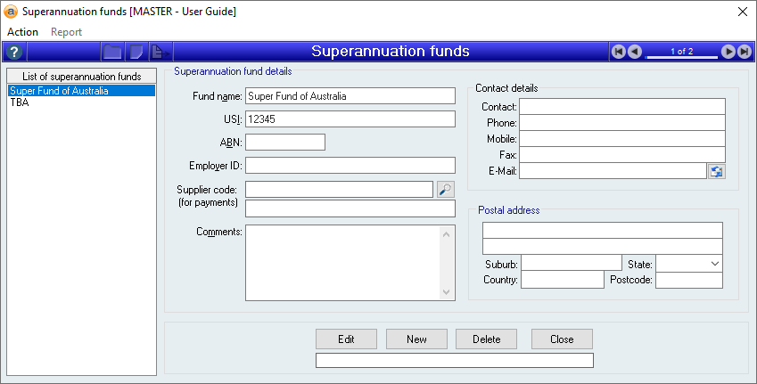 This list shows all superannuation funds currently defined and as you add new funds, they will appear in this list. As you click on each superannuation fund in the list, the details of the superannuation fund are displayed to the right of the list.