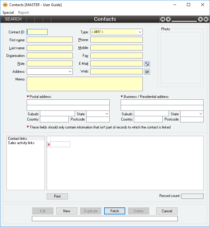 This is the assigned type of the contact and is used to categorise contacts into definable groups. Each contact must be assigned a type, but these types can be freely defined to meet your requirements via the Contact types form.
