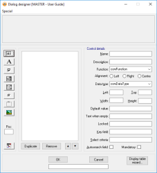 Clicking any of these button will add a new control to the top left hand corner of the dialog designer. The available controls types are as follows: