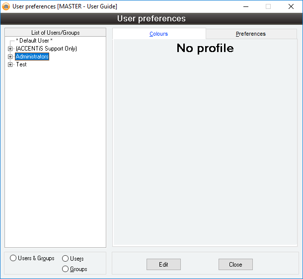 - View and edit preferences for other users, user groups, and the default profile.