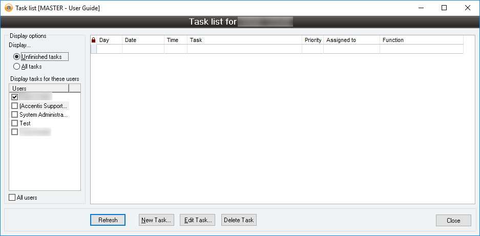 The Task list is a list of tasks that is displayed to users whenever they log in to a database. These tasks are can be created throughout Accentis Enterprise and assigned to a particular user.