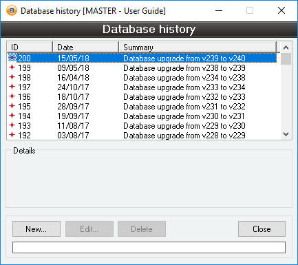 The list may also contain a number of records with a icon on the left: this indicates that this item has been added by the Database Upgrade facility and as such cannot be edited or deleted.