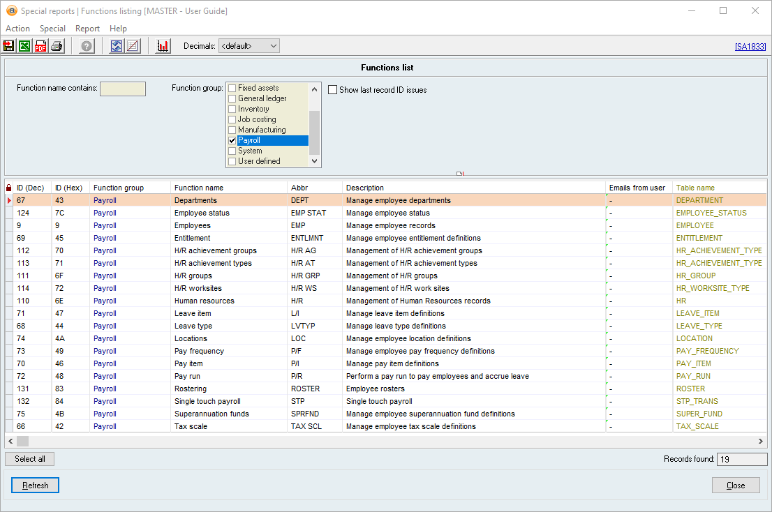 - Open SA1833 (Ctrl + Shift + R and search SA1833 or go to System > Report > Special reports > Functions listing).