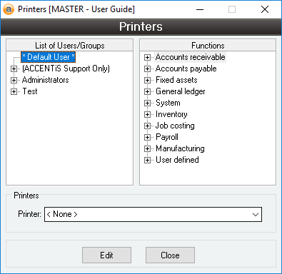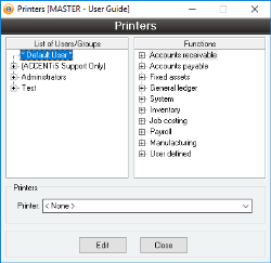 The Printers form allows a default printer to be set for a combination of users or user groups and functions. This means that whenever a user wishes to print something for a particular function, this default printer will be used unless a different printer has been otherwise specified.