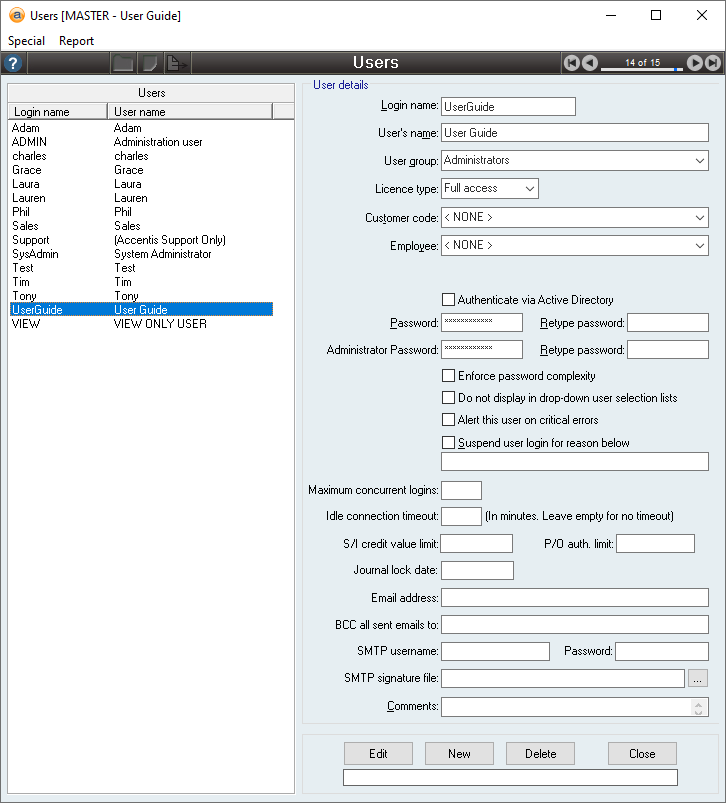 This is the name the user will be required to enter in order to gain access to Accentis Enterprise. The login name must be between 1 and 16 characters in length and must be unique with respect to all other user login names.