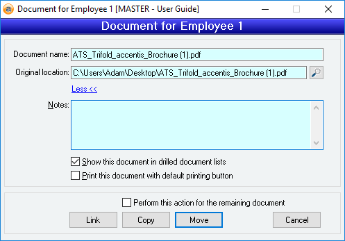 Accentis Enterprise allows you to attach electronic files or documents to any record in your system. From photographs to scans of signed contracts, there is no limit to how many documents can be attached to any individual data record. There are two ways in which a document can be attached. Either as a Managed document, copied into Accentis Enterprise, or linked to a file on a shared location.